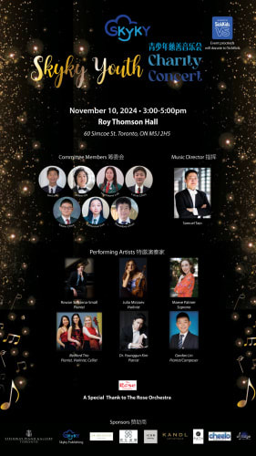 Skyky Foundation is proud to present the 5th Skyky Youth Charity Concert at the prestigious Roy Thomson Hall on November 10th, 2024. This grand event aims to support SickKids Hospital, showcasing exceptional talents and fostering a platform for young musicians to shine.